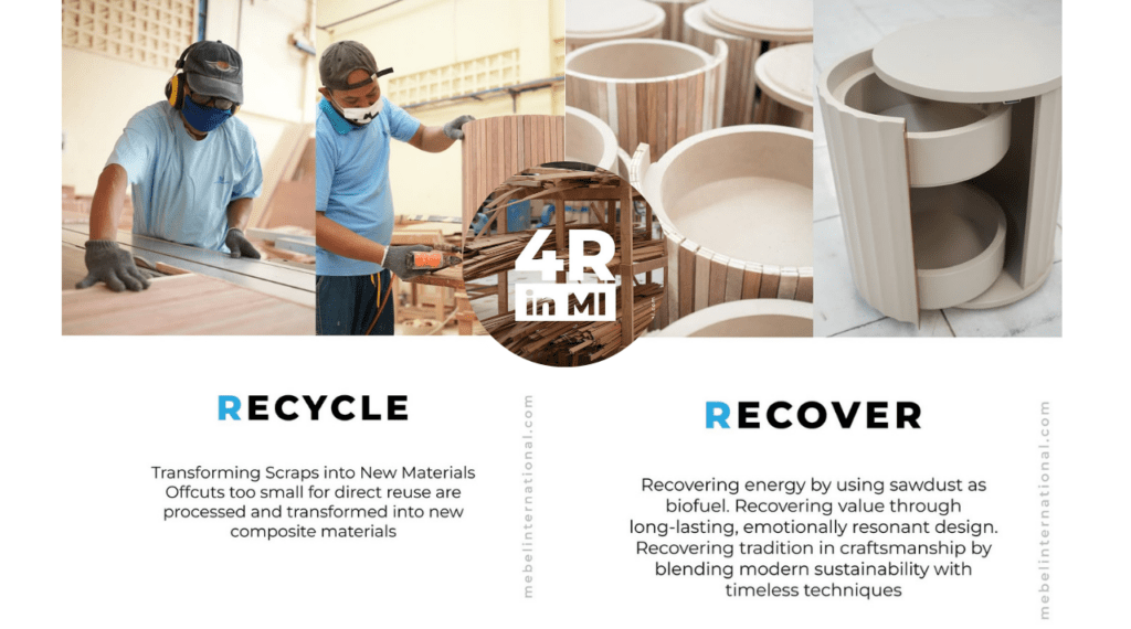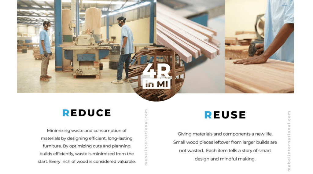 At Mebel International, sustainability is not just a concept—it is a core value that shapes how we operate every day. In 2025, we have strengthened our commitment to environmental responsibility by applying the 4R principles: Reduce, Reuse, Recycle, and Recover across our production process.